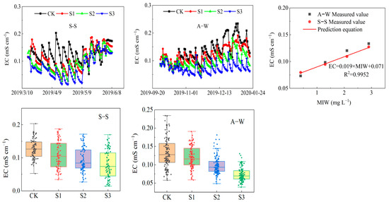 In general, there is a significant linear correlation between soil salinity concentration and soil electrical conductivity (EC) [55,56]. EC increased with increasing MIW (CK < S1 < S2 < S3) in both seasons of the experiment (Figure 9), and compared with the control CK, the soil conductivity of S3, S2, and S1 increased by 37.44% (45.58%), 25.70% (26.28%) and 14.07% (9.80%) in S–S (A–W), respectively. S1, S2, and S3 differed significantly (p < 0.05) from CK in both seasons of the experiment, and the effect of MIW on soil conductivity was highly significant (p < 0.01). The results showed that soil EC increased with increasing MIW in all cases, indicating that increasing MIW increased soil EC within the test range, which was due to the inevitable introduction of salt ions (such as Na+) when using a higher MIW for drip irrigation of the fruit cucumbers. This, in turn, increased the ion concentration in the soil solution, resulting in enhanced soil EC. Meanwhile, based on the complete monitoring data of soil conductivity during the S–S test periods, a relationship model between MIW and soil EC for fruit cucumber was constructed: EC = 0.019 × MIW + 0.071 (R2 = 0.995). It was verified using soil EC during the A–W test periods, with relative errors ranging from 2.7% to 7.8%.
