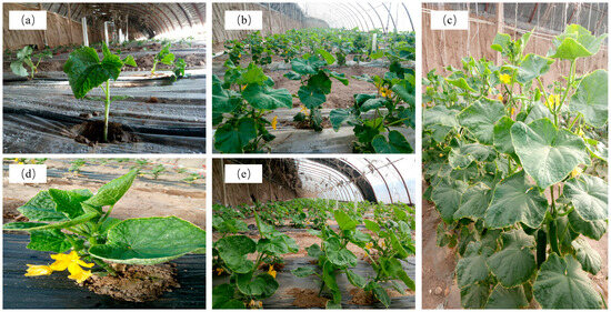 Growth of cucumbers at different growth stages in a two-season experiment. (a–c) indicate the early, middle, and late stages of cucumber growth in spring–summer (S–S), respectively. (d,e) indicate the early, and middle stages of cucumber growth in autumn–winter (A–W), respectively.