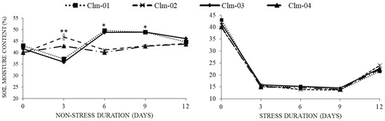 The water content in the soil decreased from the highest of 43% to 13.7% as early as 3 days after water stress treatment, irrespective of the plant species (Figure 1). Thereafter, water continuously decreased at a slower rate until the final day (day 9) of moisture stress, when the lowest moisture content was recorded for Clm-02 plants (13.7%). After re-watering, the soil water content significantly increased for all genotypes to the highest of 25% at day 12.