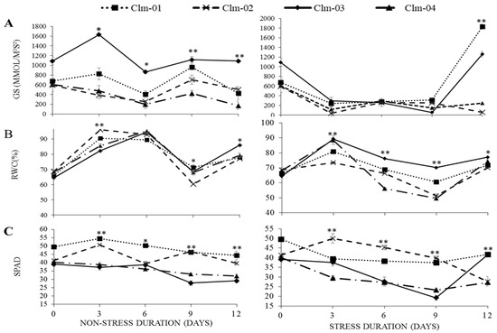 Effects of water stress on (A) stomatal conductance (GS), (B) relative water content (RWC), and (C) chlorophyll content, measured as SPAD, in non-stressed plants (control) (left panel) and drought-stressed plants (right panel). Day 12 represents stressed plants after re-watering. Error bars show standard deviations of means with n = 3. Statistical analysis was performed for each day of data collection; * significant differences at p < 0.05, ** highly significant differences at p < 0.05 per ANOVA performed using R v.4.3.1 software (2023).