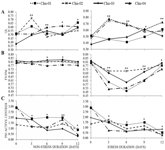Effects of water stress on (A) photochemical quenching of variable chlorophyll fluorescence (qL), (B) quantum yield of photosystem II (Fv/Fm), and (C) photosystem I active centers in non-stressed plants (control) (left panel) and drought-stressed plants (right panel). Day 12 represents stressed plants after re-watering. Error bars show standard deviations of means for n = 3. Statistical analysis was performed for each day of data collection; * significant differences at p < 0.05, ** highly significant differences at p < 0.05 per ANOVA performed using R v.4.3.1 software (2023).