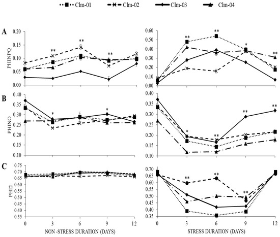Fv/Fm, the ratio of variable fluorescence to maximal fluorescence, measures the maximum efficiency of PSII (if all PSII centers are open) [35]. A decrease in Fv/Fm reflects a reduction in light use efficiency in plants [44,45]. An increase in Fv/Fm is correlated with reduced energy loss as heat [46,47,48]. In this experiment, it was observed that under drought stress, Fv/Fm decreased with increased PhiNPQ (Figure 3A and Figure 4A). In this experiment, Fv/Fm was the lowest at 0.50 for Clm-01 on day 6. The highest values were recorded in Clm-02 across all three stress days: 0.71, 0.71, and 0.74, respectively, which represents only a 0.12% reduction compared to the average Fv/Fm values in control plants. This may indicate that Clm-02 has a very important mechanism by which it is able to reduce damage to the photosystem and continue the photosynthetic process even under moisture stress. This may be true, in that Clm-02 usually produces large fruits even during extreme drought seasons [49].