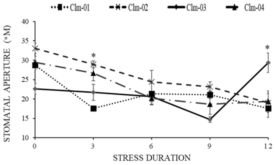 Effects of drought stress on the stomatal aperture response of four watermelon genotypes. Day 0 represents the first day before induced drought stress; days 3 to 9 represent the period of drought stress; and day 12 is the day after re-watering. Error bars show standard deviations of means for n = 5. Statistical analysis was performed for each day of data collection; * significant differences at p < 0.05, per ANOVA performed using R v.4.3.1 software (2023).