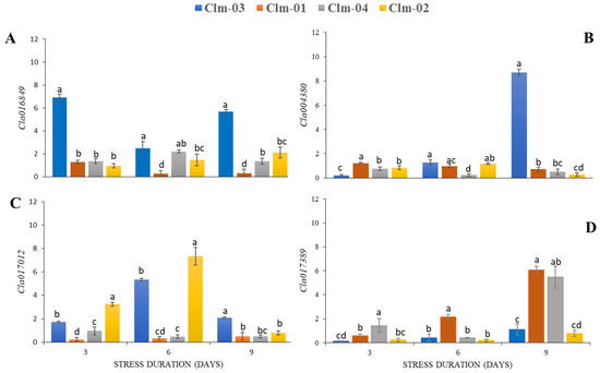 The expression patterns of genes related to stomatal aperture showed that the studied genes were related to stomatal movement (Figure 7). Clm-03 was found to have limited stomatal opening as drought stress progressed, as also shown by the expression of TFs Cla016489 and Cla004380 related to stomatal closure (Figure 7A,B). Cla004380 in Clm-03 showed the highest increase on day 9 of stress, with about an eight-fold increase compared to the other genotypes. The other three accessions had the lowest expression of the studied TFs for stomatal closure, with their stomata remaining open even under extreme stress. The expression patterns of the TFs responsible for stomatal opening had contradictory results. Cla017389 showed higher expression in Clm-01 and Clm-04 even under extreme drought stress, while Clm-03 and Clm-02 showed lower expression, suggesting that their opening was limited. The highest increase of Cla017389 was observed in Clm-01 and Clm-04 on day 9 of drought stress, with five- and six-fold increases, respectively. The results for cla017012 showed upregulation in Clm-02 and Clm-03 on day 6, then significant downregulation on day 9. Clm-01 and Clm-04 were not significantly different throughout the study, and no notable increase was observed as stress duration progressed.