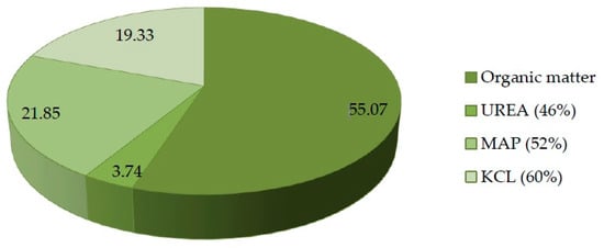 As described in detail in the materials and methods section, to satisfy the macronutrients’ needs, the mineral nitrogen fertilizer ‘UREA’ (46% N), phosphorus ‘MAP’ or mono-ammonium phosphate (52% P2O5), and potassium ‘KCL’, i.e., potassium chloride (60% K2O), were used. As a substitute for organic matter in manure, green manure, specifically white mustard, was applied. Apart from being used as a crop for oil production, white mustard also finds application as a cover crop for green manure during the interseasonal period [29,37,50,51]. The calculation based on the organic matter content in white mustard, which is 20.5% by Titei [37], yielded the results presented in Table 3. Equivalent substitutions for 100 kg of manure are presented for individual samples. Taking into account the proportions of nitrogen, phosphorus, potassium, and organic matter in the manure while considering their effects on substitution according to Marko et al. [34], the required quantities of active substances to be substituted from replacement fertilizers amounted to 0.24, 0.35, 1.07, and 31.81 kg for N, P2O5, K2O, and organic matter, respectively. In the next step, based on the quantity of active substances contained in commercial fertilizers or the organic matter of green manure, the necessary amount of replacement fertilizer was determined.