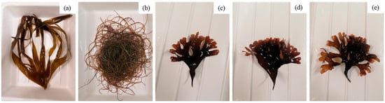Washed seaweeds: (a) S. polyschides, (b) G. gracilis, (c) C. crispus (tetrasporophyte), (d) C. crispus (non-fructified thalli) and (e) C. crispus (female gametophyte).