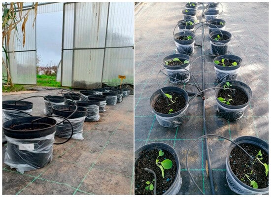 The assay was performed in 5 L black pots (with diameters of 23 cm at the top, diameters of 16 cm at the base, and 18 cm height) in conditioned substrate (SIRO, Coimbra, Portugal), under greenhouse conditions and with a natural photoperiod, at ESAC (Escola Superior Agrária de Coimbra, Portugal). Nineteen pots were organized in a randomized block design, with two turnip seeds (Flora Lusitana, Cantanhede, Portugal) sown in each pot and a plastic bag underneath to prevent water leakage (Figure 2). The substrate in all pots was fertilized with Blaukorn Classic (Blaukorn Classic 12-8-16 (+3 + TE), Compo-expert, Lisboa, Portugal) and drip irrigation was used for 6 min (±250 mL per pot) 3 times per week.