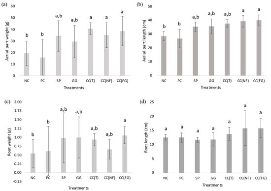 (a) Aerial part weight, (b) aerial part length, (c) root weight, and (d) root length of the fresh turnip greens from each treatment in the biostimulant and biofertilizer assay, measured after 63 days. The graphs present the average values and the standard deviation (n = 3). Statistically significant differences are marked with different letters (p < 0.05). Negative values on the y-axis are due to standard deviation calculation. NC—negative control; PC—positive control; SP—S. polyschides; GG—G. gracilis; CC(T)—C. crispus (tetrasporophyte); CC(NF)—C. crispus (non-fructified thalli); CC(FG)—C. crispus (female gametophyte).
