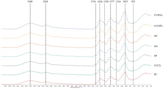 FTIR analysis is relevant in order to understand how the polysaccharide-based solutions affected the turnip greens at a metabolic and molecular level []. If we compare the FTIR-ATR similarity rate between the samples treated with polysaccharide solutions and the negative or positive controls, it corroborates all the previous results (biochemical characterization) with numbers. For example, when comparing the different samples to the negative control, we obtained CC(FG) with 118,660% (most similar but with higher content, most nutritious); CC(NF) with 110,220%; CC(T) with 87,218% (less similar); GG with 94,983%; and SP with 92,348%. When comparing the different samples to the positive control, we obtained CC(FG) with 136,430%; CC(NF) with 126,570%; CC(T) with 100,170%; GG with 109,210%; and SP with 105,970%.