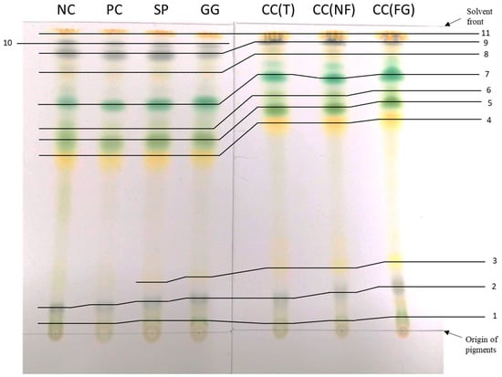 Apart from the mineral and cell wall characterization of the turnip greens, the detection and quantification of their pigments is a crucial step in further understanding the effects of the treatment groups in these plants during the experiment, especially in terms of photosynthetic activity. Overall, the Rf values observed in all treatments were greater than the Rf values found in the literature, except in the case of neoxanthin and β-carotene. This difference could be related to oxidation of the pigments, the type of silica plate used, the eluent, the plant species, and the quantity of the solution applied to the TLC []. The absence of pigment marked as “10” in the C. crispus’ TLC could be explained by the pigment’s entrainment at the end of the silica plate, preventing us from differentiating the pigments clearly. Overall, the turnip greens treated with the carrageenans extracted from C. crispus exhibited the greatest pigment content among all treatments. An increase in a pigment such as chlorophyll can indicate an increase in photosynthetic activity and, consequently, an increase in plant growth and development. This means that plant carbohydrate production boost could be related to the application of carrageenans from C. crispus in the early growth stages of the plants.
