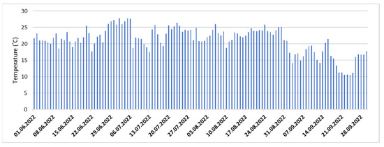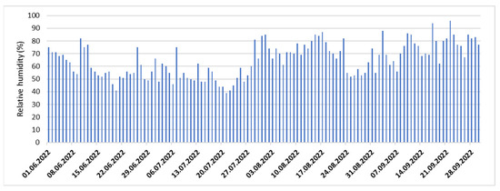 The National Meteorology Centre in Iasi recorded an average temperature for the Iasi area in 2022 that ranged from 10.5 °C (September) to 27.8 °C (July) (Figure 1); the maximum precipitation value during the experiment reached 38.2 mm (August) (Table 1); the recorded average relative humidity ranged from 39% (July) to 96% (September); and the wind intensity ranged from 1.4 to 2 m/s (January–December) (NMA). (Humidity was measured on 41 of the 122 days of the experiment; Figure 2).