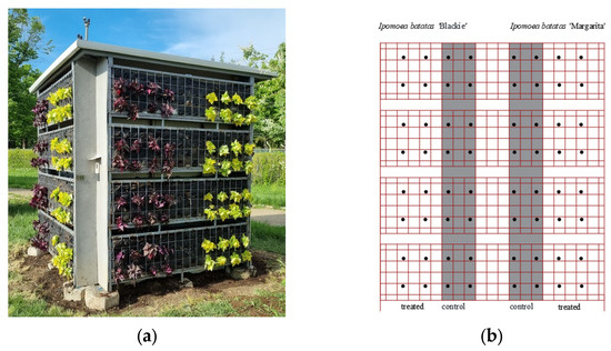 ‘Blackie’ and ‘Margarita’ of I. batatas were arranged on each tier, one below the other in two distinct columns. The planting pattern was identical on all four faces of the experimental structure (Figure 3b).