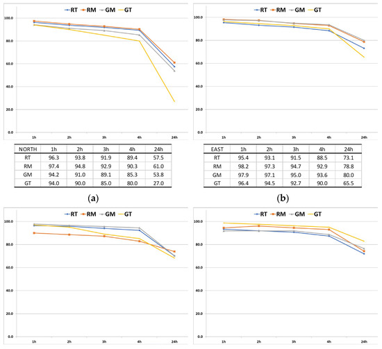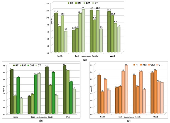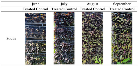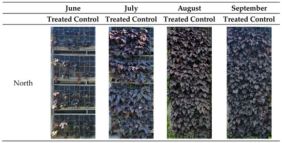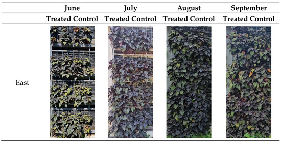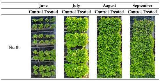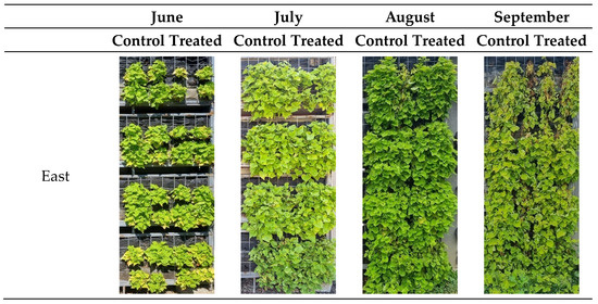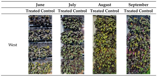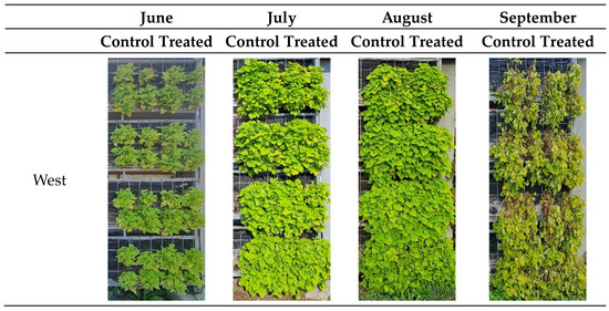 We noted from the compared images that the north orientation was the most favourable among the façades, regardless of the month and the experimental variant (Figure 5). Additionally, we noticed that plants tended to start declining significantly earlier in the west orientation than in other orientations (Figure 8).