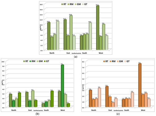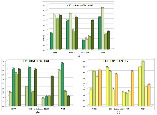 The nutrient mixture used for the two ornamental varieties used in this research was sampled at two depths (0–20 cm and 20–40 cm) for each of the four orientations (north, east, south, and west) of the module. The nutrient mixture samples were analysed following the standard methods of our country and with the instructions provided by the National Research–Development Institute for Pedology, Agrochemistry and Environmental Protection (ICPA), Bucharest [34]. Prior to the start of the study, the nutrient mixture properties of 0–40 cm had a very strongly to moderately acidic reaction, a low content in total phosphorus , and a medium content in total potassium .