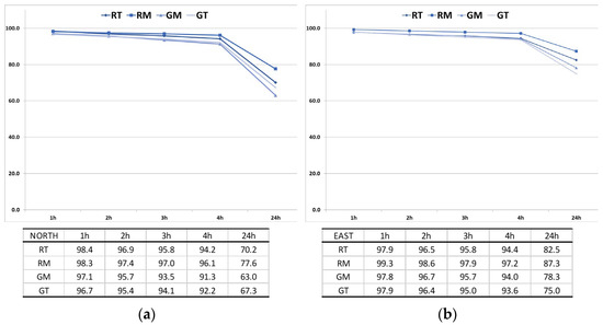 The plants in the east zone of the experimental structure had a very low dehydration rate in August, both in the first hour and at 2, 3, and 4 h, with 0.7% to 2.2% water lost in the first hour (Figure 17b).