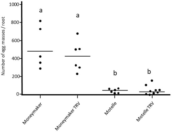 The effect of agroinfiltration on M. javanica infestation was evaluated by comparing the level of infestation in non-infiltrated susceptible Moneymaker and resistant Motelle plants with that of plants of the same varieties infiltrated with the empty pTRV1:pTRV2 vector (TRV). Significant differences in the number of egg masses were detected according to the Kruskal–Wallis test (H = 17.936; df = 3; p = 0.0004534). As the results in Figure 1 show, the number of egg masses on plants infiltrated with the empty TRV and non-infiltrated plants did not differ significantly, regardless of the cultivar. The number of egg masses per root was significantly lower in the Motelle variety compared to Moneymaker, both in infiltrated and non-infiltrated plants. Thus, infiltration with empty TRV did not affect the infestation of tomato by nematodes.
