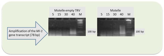 Agarose gels with transcripts of the Mi-1 gene amplified by semiquantitative PCR from roots of Motelle plants infiltrated with the TRV empty vector and Mi-1-silenced Motelle plants (Motelle TRV:Mi-1). The number of PCR cycles used is indicated at the top of the figure, as well as the molecular marker (M).