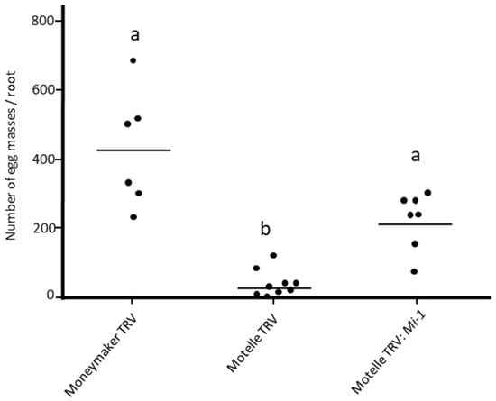 Number of M. javanica egg masses per root of Moneymaker (mi-1/mi-1) and Motelle (Mi-1/Mi-1) plants infiltrated with the empty pTRV1:pTRV2 vector (TRV) and on Motelle plants agroinfiltrated with the vector pTRV1:pTRV2-Mi (Motelle TRV-Mi). Each dot represents the number of egg masses on a plant. The lines indicate the median values. Different letters indicate significant differences (p < 0.05) by the non-parametric Kruskal–Wallis test and Dunn’s post test. This assay was repeated twice with similar results.