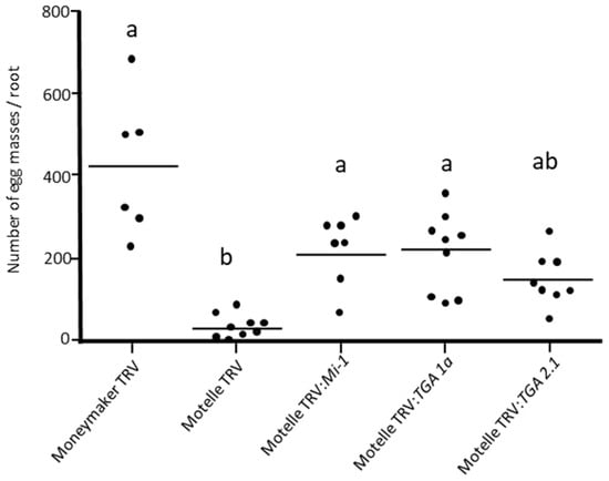 Number of M. javanica egg masses per root of Moneymaker (mi-1/mi-1) and Motelle (Mi-1/Mi-1) plants infiltrated with the empty pTRV1:pTRV2 vector (TRV) and on Motelle plants agroinfiltrated with pTRV1:pTRV2-Mi-1 (Motelle TRV:Mi-1), pTRV1:pTRV2-TGA 1a (Motelle TRV:TGA 1a), and pTRV1:pTRV2:TGA 2.1 (Motelle TRV:TGA 2.1). Each dot represents the number of egg masses on a plant. The lines indicate the median values. Different letters indicate significant differences (p < 0.05) by the non-parametric Kruskal–Wallis test and Dunn’s post test. This assay was repeated twice with similar results.