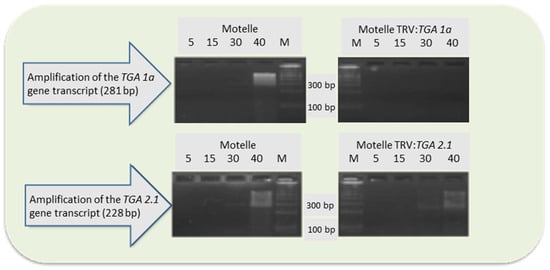 Agarose gels with transcripts of the TGA 1a and TGA 2.1 genes amplified by semiquantitative PCR from roots of Motelle plants infiltrated with the TRV2 empty vector (Motelle TRV2), TGA 1a-silenced Motelle plants (Motelle TRV2:TGA 1a), and TGA 2.1-silenced Motelle plants (Motelle TRV2:TGA 2.1). The number of PCR cycles used is indicated at the top of the figure, as well as the molecular marker (M).