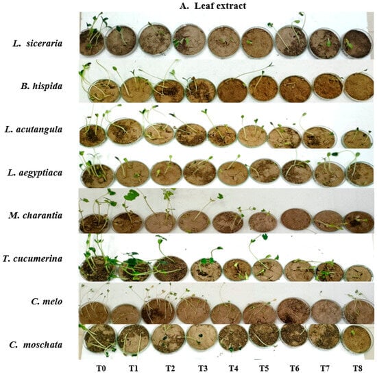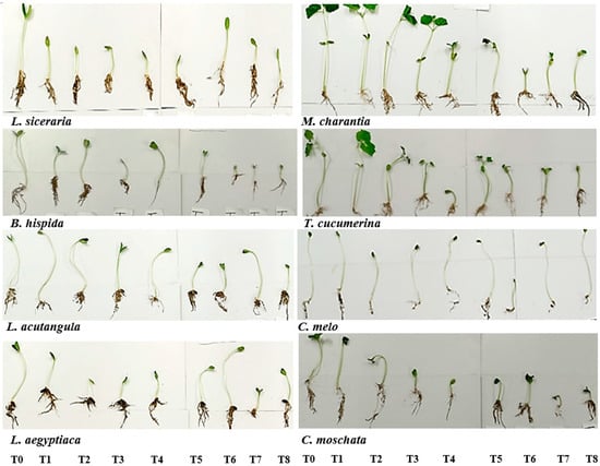 Methanol extract treatments (T5–T8) continued this trend of reduced germination percentages. T. cucumerina dropped from a control value of 90.66 ± 0.85 to 10.66 ± 0.47% (p < 0.001) in T7. Certain treatments, like T8 for C. melo and L. acutangula, resulted in a substantial germination percentage decrease, compared to the control (20.33 ± 0.47% and 20.00 ± 0.81%, (p < 0.05), respectively), suggesting some specific concentrations of the extracts might not significantly affect germination (Table 4 and Figure 3).