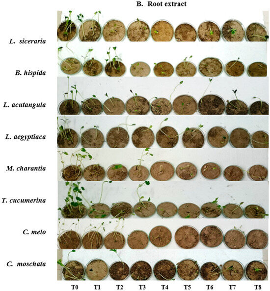 Table 3 outlines the effects of various treatments with aqueous and methanol H. indicum leaf extracts on the root length of eight cucurbit crops, at 9 days (Figure 4). On the other hand, the control treatment (T0), untreated shows the initial root lengths: L. siceraria (8.1 ± 0.21 cm), B. hispida (9.13 ± 0.12 cm), L. acutangula (7.06 ± 0.04 cm), L. aegyptiaca (8.1 ± 0.08 cm), M. charantia (6.06 ± 0.04 cm), T. cucumerina (5.43 ± 0.09 cm), C. melo (6 ± 0.08 cm), and C. moschata (10.23 ± 0.20 cm). For the aqueous-extract treatments (T1–T4), the root lengths varied, with some reductions and some increases, compared to the control. In the case of L. siceraria, the root length decreased in T1 to 6.46 ± 0.12 cm (p < 0.001) but had increased to 8.36 ± 0.12 cm by T4, which is close to the control length.