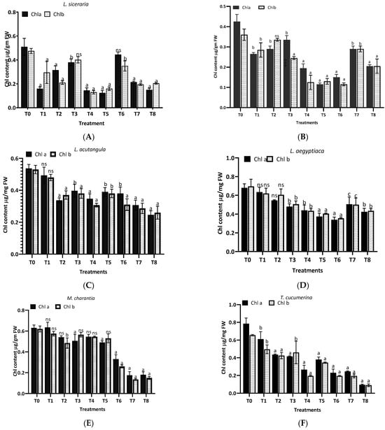 Treatment of aqueous (T1–T4) and methanol (T5–T8) extracts of the leaf of H. indicum on the chlorophyl content; a = p < 0.0001, b = p < 0.001, and c = p < 0.05; ns indicates not significant. (A) (Lagenaria siceraria), (B) (Benincasa hispida), (C) (Luffa acutangula), (D) (Luffa aegyptiaca), (E) (Momordica charantia) (F) (Trichosanthes cucumerina), (G) (Cucumis melo), and (H) (Cucurbita moschata).