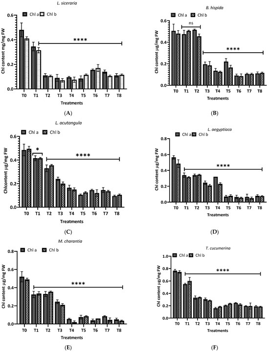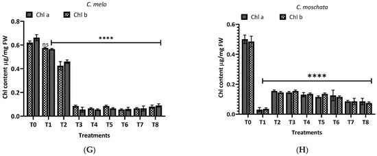 Further, in M. charantia (E), the control exhibited the highest chlorophyll a and b content. A dramatic reduction in chlorophyll content was observed in response to the treatments, with the methanol extracts (T5–T8) showing a highly significant reduction (p < 0.0001) for both chlorophyll types. Again, for T. cucumerina (F), chlorophyll a and b levels in the control remained high, similar to M. charantia. Post treatment, there was a pronounced decrease in chlorophyll content, with methanol extracts (T5–T8) exhibiting a highly significant reduction (p < 0.0001) in both chlorophyll a and b. For C. melo (G), the control group showed the highest chlorophyll a and b levels. Upon treatment, chlorophyll levels did not differ significantly (ns), but chlorophyll b levels were affected considerably by methanol extracts (T5–T8), with a notable reduction (p < 0.0001). In the case of C. moschat (H), the control group showed the highest chlorophyll a and b content. Treatments led to a significant decline in chlorophyll a and b, particularly with the methanol extract treatments (T5–T8), where the decrease was highly significant (p < 0.0001).