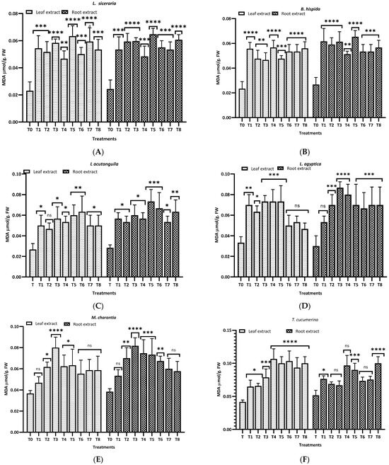 Figure 8 illustrates the malondialdehyde (MDA) levels observed in this study for different plants and treatments. For L. siceraria (A), both leaf and root extracts showed a significant increase in MDA content across all treatments, compared to the control, with the highest significance observed in T3, T5, and T7 for both, and in T2 and T7 for root extracts (p < 0.0001). In B. hispida (B), the MDA levels also increased significantly in response to the treatments, with T1, T7, T4 and T8 (leaf) and T1, T2, T3 and T5 (root) showing the most significant effects (p < 0.0001). For L. acutangula (C), the results were more varied; some treatments did not significantly affect T2 (leaf) MDA levels (ns), while others, like T5, and T6 (root) showed high significance (p < 0.001). Interestingly, T1 demonstrated a significant decrease in MDA content (p < 0.05). L. aegyptiaca (D) displayed a pattern where the leaf extract treatments (T1–T4) generally resulted in higher MDA levels (p < 0.05 to p < 0.001), whereas T3 and T4 of root extracts showed extremely significant increases (p < 0.0001) of MDA levels, compared to control.