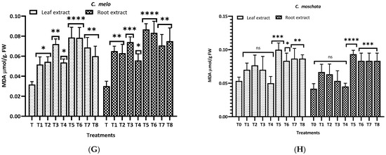 In M. charantia (E), significant increases in MDA content were observed in treatments T2, T4, T5, and T7 (p < 0.05 to p < 0.001), with the highest significance in T4 (p < 0.001), for both extracts. Conversely, several treatments did not significantly affect MDA levels (ns). For T. cucumerina (F), the MDA response was profound, particularly in treatments T4, T6, T7, and T8, with all showing extremely significant increases (p < 0.0001). However, some treatments did not significantly alter MDA content (ns). C. melo (G) showed significant variation in MDA levels, with the most pronounced increases in T5 and T6 (p < 0.0001) in both cases. Other treatments also significantly elevated MDA content (p < 0.01), while T1, T2 (leaf), and T4 (both) were less impactful, yet still significant (p < 0.05). Lastly, C. moschata (H) exhibited significant increases in MDA content with treatments T5 to T8 (p < 0.05 to p < 0.0001), indicating a strong response to both aqueous and methanol leaf extracts. Notably, T1 and T4 did not significantly affect the MDA levels (ns).