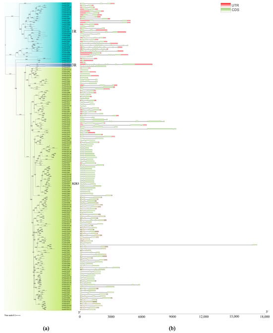 To understand the structure of the AmMYB genes, an analysis was conducted on the intron–exon relationship of the AmMYB genes (Figure 1). A phylogenetic tree was constructed based on the protein sequences of 162 AmMYB proteins, which were classified into three subfamilies. The number of exons in the AmMYB genes ranged from 1 to 8, with a minimum of 1 exon observed in 5 genes and a maximum of 108 exons found in 3 genes. Most AmMYB genes exhibited 2 or 3 exons. Notably, closely clustered AmMYB genes shared similar exon–intron structures, particularly regarding exon length and quantity.