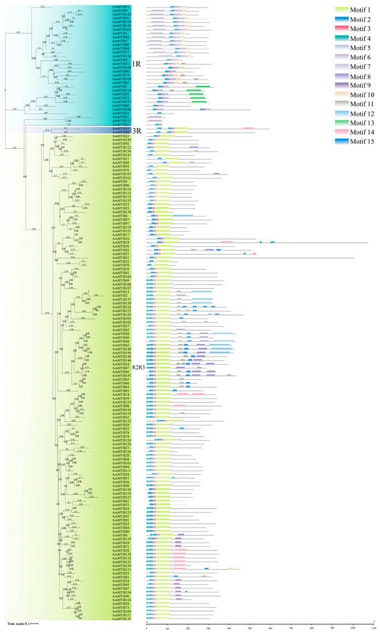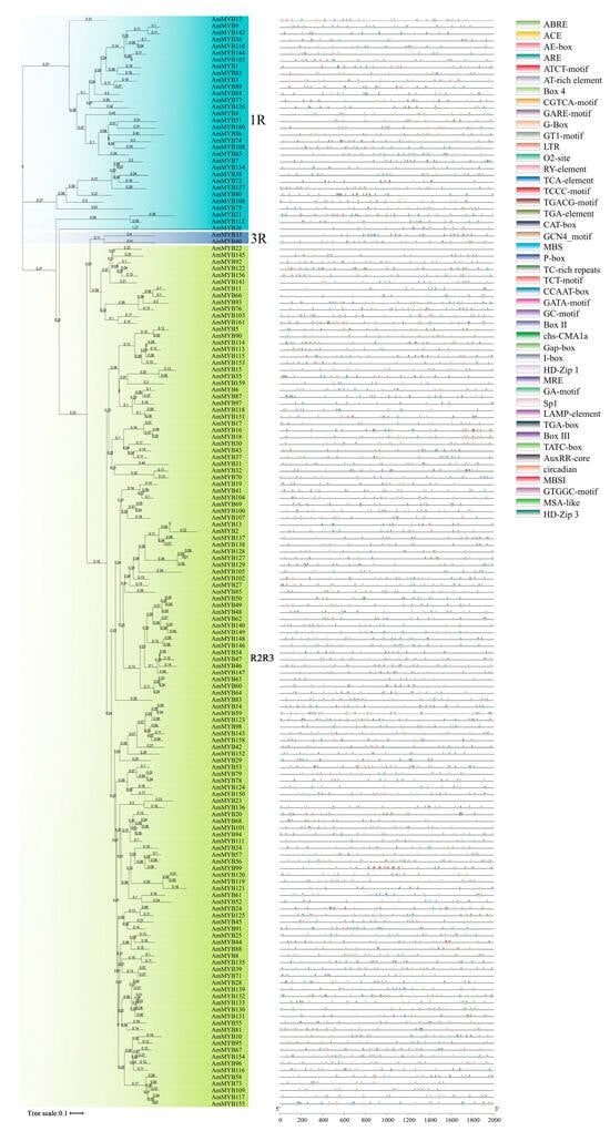 Using the online software MEME (https://meme-suite.org/meme/, accessed on 7 October 2023) to perform conserved motif analysis on AmMYB proteins. The TBtools software v2.028 built-in function (gene structure view) was used to visualize the gene structure (UTR/exon/intron) simultaneously [].