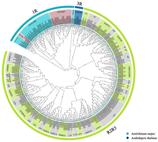 Phylogenetic analysis of MYB proteins from A. majus L. and A. thaliana. Dark blue circles represent Arabidopsis MYB members, light blue circles represent snapdragonMYB members; different color arcs represent MYB subfamily classification; groups were identified according to the subfamilies in Arabidopsis.