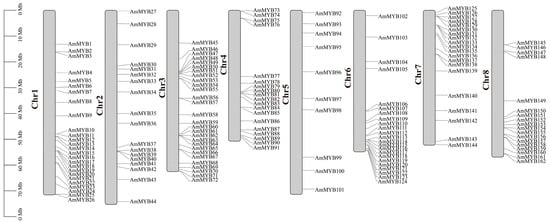 The chromosomal localization information of AmMYB gene family members was determined using the snapdragon gene annotation file (Figure 4). As depicted in Figure 3, the distribution of AmMYB genes spans across all eight chromosomes. Among them, chromosome 1 harbors 26 AmMYB genes, chromosome 2 contains 18 AmMYB genes, chromosome 3 possesses 8 AmMYB genes, chromosome 4 encompasses 19 AmMYB genes, chromosome 5 accommodates 10 AmMYB genes, chromosome 6 houses 23 AmMYB genes, chromosome 7 contains 20 AmMYB genes and chromosome 8 has 18 AmMYB genes. From the perspective of subfamily classification, 1R-AmMYB is distributed except for chromosome 5, it is predominantly concentrated on chromosomes 1 and 4, with a total of 8 AmMYB genes present, while the distribution of the 3R-AmMYB subfamily is limited to chromosome 2 only. The lengths of chromosomes 1 to 8 are 71.72 Mb, 75.46 Mb, 62.72 Mb, 50.91 Mb, 71.57 Mb, 55.04 Mb, 52.49 Mb and 57.08 Mb, respectively. These findings suggest that the distribution pattern of different AmMYB subfamily members does not necessarily correlate with chromosome length.