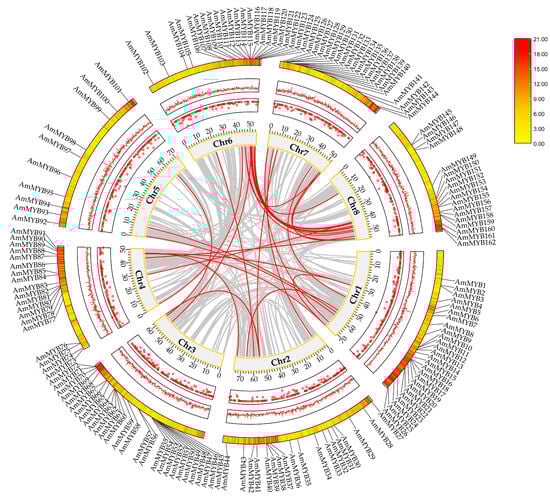 The physical location of the AmMYB genes (Gene Location Visualize), tandem replication and fragment replication events can be determined by utilizing GFF files and genome sequence files, MYB and visualized with TBtools.