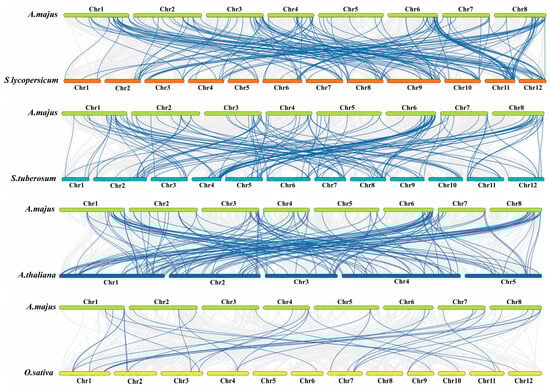 Replication events within and between species were evaluated using TBtools software MCS canX (version 2.041). The genome files of rice, tomato, potato, and Arabidopsis are from the National Center for Biotechnology Information website (https://www.ncbi.nlm.nih.gov/, accessed on 1 October 2023).