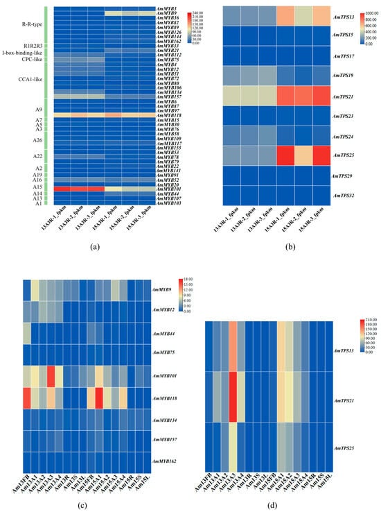 Gene expression heatmap. (a,b) FPKM of AmMYB and AmTPS genes during the A3 stage of Am13 and Am15 cultivars. (c,d) Expression levels of 9 AmMYB and 3 AmTPSs genes of Am13 and Am15 cultivars. (FB, A1, A2, A3, A4: different flowering stages; R: root; S: stem; L: leaf).