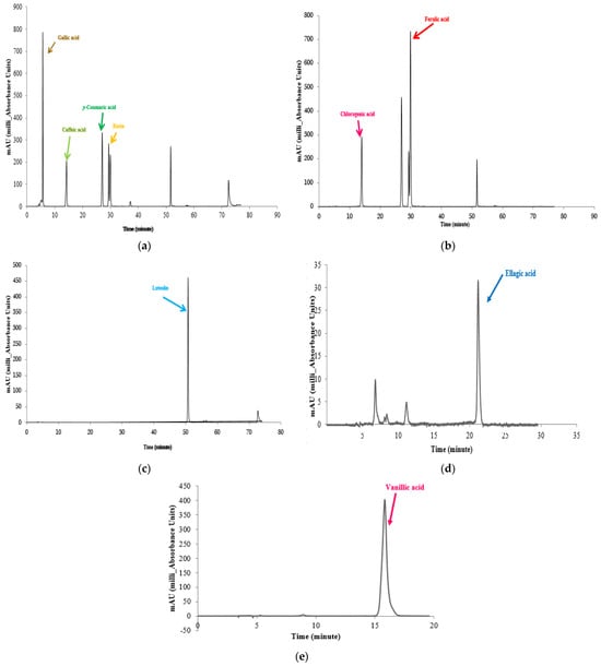 Standard curves for the composition of gallic acid, caffeic acid, p-coumaric acid and rutin (a). Standard curve for the composition of chlorogenic acid and ferulic acid (b). Standard curve for the composition of luteolin (c). Standard curve for the composition of ellagic acid (d). Standard curve for the composition of vanillic acid (e).