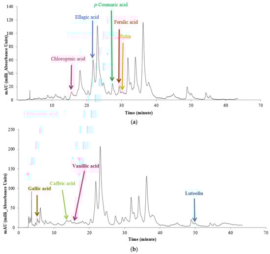 In this study, gallic acid, chlorogenic acid, caffeic acid, p-coumaric acid, ellagic acid, ferulic acid, vanillic acid, and ellagic acid were the most abundant phenolic acids detected. For illustration purposes, an example chromatogram of one variety of hollyhock is depicted in Figure 3, in which phenolic and flavonoid determinations are reported as mg per 100 g of the sample’s dry weight. The interaction of variety and salt stress upon the production of gallic acid, chlorogenic acid, caffeic acid, p-coumaric acid, ferulic acid, vanillic acid, ellagic acid, luteolin, and rutin was shown to be significant at the 1% probability level (Table 6).
