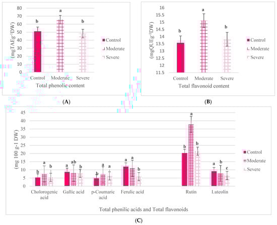 Figure 4A–C shows the effect of salt stress on the recorded traits including TPC, TFC, gallic acid, chlorogenic acid, p-coumaric acid, ferulic acid, rutin, and luteolin. In general, the results show that moderate salt stress results in an increase in TPC, TFC, chlorogenic acid, p-coumaric acid, and rutin compared to the control levels. Meanwhile, severe salt stress led to decreases in TPC, TFC, rutin, gallic acid, chlorogenic acid, and ferulic acid compared to the control and moderate salt stress. When plants grown under severe salt stress were compared to those grown under moderate stress, the maximum reduction was observed in the levels of ferulic acid (51%), rutin (43%), and chlorogenic acid (28%), respectively. The extent of the reduction in TPC observed in plants exposed to severe salt stress compared to the control was 27%. In fact, although the level of these traits increased under moderate salt stress when compared to the control plants; severe salt stress led to a decrease in the amounts of these compounds.