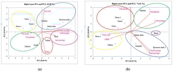 In order to assess the relationship between the traits of TPC, TFC, DPPH, mucilage (petal, leaf, and seed), and yield and the grouping of the populations, analyses were performed on these traits at the control and high stress levels and the biplot of the two components. The PCA results indicate that 63% and 73% of the total variability could be explained by the first two principal components under normal and salt-stress conditions, respectively (Figure 5a,b).