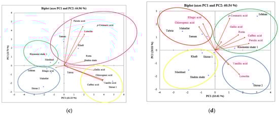 According to Figure 5c,d, the populations are divided into four groups. Shiraz 2, Mahallat, and Isfahan were placed in the same group and had strong correlations with regards to their ellagic acid content. The Khafr and Saman varieties were also in the same group and had a strong correlation with respect to their ferulic acid, p-coumaric acid, luteolin, and rutin content. However, Shiraz 1 was placed in a category by itself and contained high levels of vanillic acid, caffeic acid, and gallic acid. The Tabriz and Shahin Shahr varieties were also placed in a separate category. According to Figure 5d, Shiraz 2 was placed in separate category and displayed a high correlation with the luteolin and vanillic acid compounds. The Isfahan and Khomeini Shahr varieties displayed a high correlation with regards to the ferulic acid, gallic acid, rutin, p-coumaric acid, and gallic acid compounds. Saman, Mahallat, and Tabriz also performed strongly in terms of their chlorogenic acid and ellagic acid content.