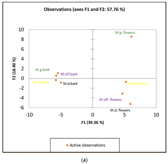Linalool and Limonene are dominant in the flower extracts of this species, contributing to its distinct aromatic profile. For M. denudata, like in M. champaca, the flower extracts exhibit a notably higher concentration of volatile compounds compared to the bark. Linalool and Limonene are prominent in the flowers of M. denudata, contributing significantly to their characteristic aroma. This suggests that the flowers of M. denudata are particularly enriched with these compounds, which are known for their distinctive fragrances. In the case of M. grandiflora, there are significant differences in the volatile compound profiles between the bark and flowers. The flowers of M. grandiflora are characterized by a high content of Linalool, whereas the bark is notable for its substantial amounts of Camphor. This indicates a distinct chemical composition in different parts of the plant, each contributing uniquely to the overall aromatic and phytochemical profile of M. grandiflora. Like M. champaca and M. denudata, the flowers of M. officinalis also contain a greater variety and concentration of volatile compounds than the bark. Notably, Linalool, Limonene, and Camphor are key compounds in the flowers of this species. This pattern reinforces the trend observed across these Magnolia species, where the flower extracts generally have a richer and more diverse array of volatile compounds compared to the bark. Using statistical models, the main components were grouped based on the aromatic profile of the extracts from the bark and flowers of the four Magnolia species (M. champaca, M. denudata, M. grandiflora, and M. officinalis). The obtained values are notably lower than those reported in previous studies. Baez et al. [42] reported the most abundant compounds: β-Pinene (10.5%), geraniol (7.4%) and germacrene D (6.2%), (E)-β-ocimene (24.6%), geraniol (18.9%), and β-elemene (11.2%) and germacrene D (9.9%); Farag et al. [43] reported farnesol (18%), 2-phenylethanol (10%), germacrene D (17%), and β-bisabolene (17%). The observed differences in the data reflect the variability in aromatic profiles both between different Magnolia species and between various parts of the plant [44]. Moreover, there is a notable variation in both the concentration and composition of these volatile compounds across different species. It is imperative to acknowledge that these diverse volatile entities significantly contribute to the distinct aromas and characteristics inherent to each Magnolia species. The unique aromatic profiles emanating from these compounds present the potential for utilization in a variety of sectors, including but not limited to the cosmetic, perfumery, and medicinal industries. Their distinctive properties can be leveraged in the development of fragrances, therapeutic agents, or other specialized applications, highlighting the significance of comprehensively understanding and characterizing these volatile compounds in Magnolia species.