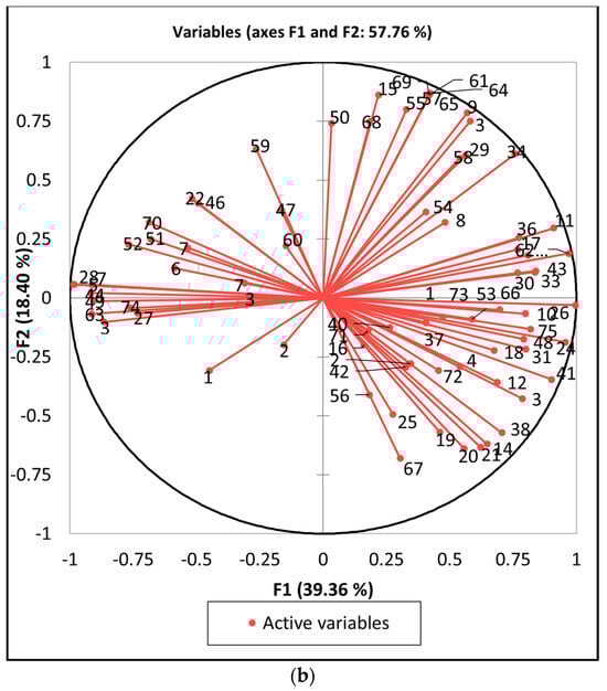 Differentiation based on species of bark and flower extracts against compositional profile: (a) the PCA diagram illustrates the differentiation of bark and flower extracts based on their compositional profiles. The principal axes represent 57.76% of the total variance in the data set. (b) displays the graphical representation of PCA variation according to the species studied, in relation to compositional variability. Legend: 1. Hexanal, 2. Heptanal, 3. α-Thujene, 4. α-Pinene, 5. Camphene, 6. Sabinene, 7. β-Pinene, 8. 6-Methyl-5-hepten-2-one, 9. α-Phellandrene, 10. α-Terpinene, 11. p-Cymene, 12. Limonene, 13. 1,8-Cineol, 14. β-Phellandrene, 15. (Z)-β-Ocimene, 16. Phenylacetaldehyde, 17. (E)-β-Ocimene, 18. γ-Terpinene, 19. 1-Octanol, 20. cis-Sabinene hydrate, 21. cis-Linalool oxide (furanoid), 22. trans-Linalool oxide (furanoid), 23. Terpinolene, 24. Linalool, 25. €-4,8-Dimethylnona-1,3,7-triene, 26. Perillene, 27. Camphor, 28. Borneol, 29. Terpinen-4-ol, 30. α-Terpineol, 31. Myrtenol, 32. Myrtenal, 33. β-Citronellol, 34. Nerol, 35. Neral, 36. Geraniol, 37. Geranial, 38. 1-Decanol, 39. Bornyl acetate, 40. Myrtenyl acetate, 41. Eugenol, 42. α-Copaene, 43. β-Elemene, 44. Ε-Caryophyllene, 45. α-trans-Bergamotene, 46. β-Caryophyllene, 47. (Z)-β-Farnesene, 48. α-Humulene, 49. 9-epi-(E)-Caryophyllene, 50. γ-Gurjunene, 51. Germacrene D, 52. α-Selinene, 53. γ-Muurolene, 54. Viridiflorene, 55. Bicyclogermacrene, 56. δ-Cadinene, 57. Hedycaryol, 58. Elemol, 59. trans-Nerolidol, 60. (E)-Nerolidol, 61. Palustrol, 62. Germacrene D-4-ol, 63. Spathulenol, 64. Globulol, 65. β-Eudesmol, 66. α-Cadinol, 67. Selin-11-en-4-α-ol, 68. Shyobunol, 69. (E)-Nerolidyl acetate, 70. (Z,E)-Farnesol, 71. 14-Hydroxy-α-muurolene, 72. 14-Hydroxy-δ-cadinene, 73. n-Hexadecanol, 74. n-Heneicosane, 75. Linoleic acid, 76. n-Tricosene, 77. n-Pentacosane.