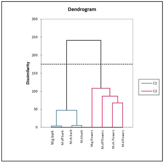 In Figure 1a, the flower extracts of M. grandiflora are particularly distinct, positioned in the second quadrant, and are characterized by a rich composition of various volatile compounds. These include α-Thujene, α-Pinene, α-Terpinene, Limonene, (E)-β-Ocimene, γ-Terpinene, 1-Octanol, Linalool, α-Terpineol, Myrtenol, Nerol, and Geraniol. Their location in the second quadrant suggests a unique volatile profile that sets them apart from the other extracts studied. Bark extracts of M. grandiflora and M. officinalis are near the axis dividing the quadrants, being rich in volatile compounds such as α-Thujene, α-Pinene, β-Pinene, Limonene, 1-Octanol, Bornyl acetate, β-Caryophyllene, 9-epi-(E)-Caryophyllene, and Germacrene D. In quadrant one, on the negative semi-axis, the bark extracts of M. champaca (M.ch.) and M. denudata (M.d.) are shown, represented by compounds like β-Pinene, Limonene, Camphor, Bornyl acetate, E-Caryophyllene, Germacrene D, Viridiflorene, Spathulenol, etc. In quadrant two, on the negative semi-axis, the flower extracts of M. champaca (M.ch.) are shown, which are rich in α-Thujene, Limonene, (E)-β-Ocimene, γ-Terpinene, 1-Octanol, Linalool, and M. denudata (M.d.), along with M. officinalis (M.off.), with significant values in volatile compounds such as α-Thujene, α-Pinene, Limonene, 1-Octanol, Linalool, β-Citronellol, Geraniol, etc. (Figure 1b). The multivariate analysis was complemented by a cluster analysis that minimized variation within the group, revealing two distinct clusters for bark and flowers (Figure 2. In this study, a wide range of metabolites was observed, with the quantity of volatile compounds differing based on both the source and the species from which the extracts were derived. The vectors depicted in the graphical representations illustrate the contribution of each compound to the overall distribution of variables, highlighting how individual components influence the compositional makeup of the extracts. Additionally, the multivariate analysis was further enhanced by conducting a cluster analysis. This analysis focused on minimizing the variation within each group, leading to the identification of two distinct clusters corresponding to bark and flower extracts. This differentiation is clearly depicted in Figure 2, effectively showcasing the inherent compositional differences between the bark and flower extracts of the Magnolia species studied.