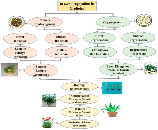 Elegant propagation features of plant tissue culture technologies were reviewed, and discussed the work carried out worldwide on direct and indirect organogenesis and in vitro cormel production [29]. Its assessments omitted to mention the critical aspects that influenced the in vitro conditions that are required for optimal microplant growth and development, as well as cormel production. This review failed to clarify the role of the cell suspension culture via somatic embryogenesis and the factors that affect its efficiency. Little information on gladiolus micropropagation was covered in the review of the use of micropropagation and related biotechnological techniques for ornamental flowering bulbs with a focus on the Iridaceae family [49]. Recently, Datta et al. [50] discussed about ornamental gladiolus breeding. His main areas of interest induced mutation, classical improvement, cytology, characterization, disease management, germplasm collections, and the paucity of knowledge regarding gladiolus production in vitro. In the current analysis, we focus on different methods used for in vitro propagation as well as cormel formation; factors affecting in vitro propagation as well as in vitro cormels’ efficiency; acclimatization of microplantlets and microcormels; and field transfer of microplants as well as cormels. To the author’s knowledge, the present review is unique in the sense of complete micropropagation protocols for microplants as well as in vitro cormels and may also have an impact on how future research is conducted in gladiolus on cell culture.