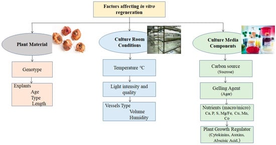 For successful micropropagation, in vitro establishment is one of the most crucial steps. This step is influenced by three key factors: genotype selection, explant selection, and sterilization treatment. Differentiation and development within a specific cultural context and situation can be achieved with the right selection of explants (Table 1 and Table 2 and Supplementary Table S1). Some key elements that affected plantlet in vitro efficiency are shown in Figure 2.