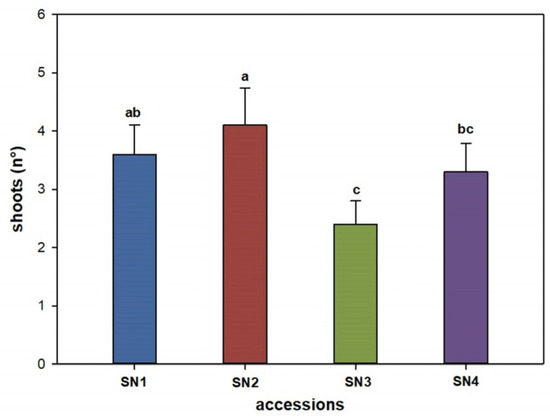 Effect of Sorbus accessions on the number of shoots produced per explant. Bars represent standard error, and the different letters above grouped for each individual treatment indicate statistically significant differences (Tukey’s test, p ≤ 0.05).