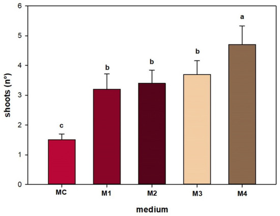 Effect of different PGRs on the number of Sorbus shoots obtained per explant. The bars represent the standard error, and the different letters above grouped for each individual treatment indicate statistically significant differences (Tukey’s test, p ≤ 0.05).