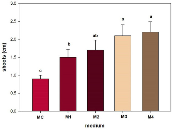 Effect of different PGRs on shoot length of Sorbus per explant. Bars represent standard error, and the different letters above grouped for each individual treatment indicate statistically significant differences (Tukey’s test, p ≤ 0.05).
